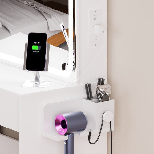 The vanity comes with two standard jacks and two USB ports for easy connection to hair dryers, hair curlers and more, as well as charging your phone, tablet or other mobile device.